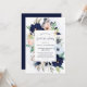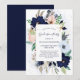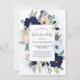 This stylish and trendy graduation party invitation features a modern rectangular frame with nautical coloured watercolor flowers. Hydrangea, peony, and anemone flowers appear in shades of navy blue, light blue, and blush pink with green and neutral beige leaves, along with starfish. The background of the card is decorated with a pale blue watercolor wash and splashes, and the back of the invitation is a dark navy blue.