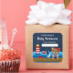 This cute and fun baby shower bookplate features a nautical sailor girl bear on a wooden deck with a seagull and a crab. In the background there is a red and white lighthouse, a cute bird on a sailboat, ocean waves and a navy blue starry night sky. The text combines bold and serif fonts for a stylish and modern look. This is perfect for a nautical themed baby shower.