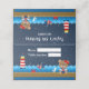 This cute and fun seating place card features a nautical sailor girl bear on a wooden deck with a seagull and a crab. In the background there is a red and white lighthouse, a cute bird on a sailboat, ocean waves and a navy blue starry night sky. The text combines bold and serif fonts for a stylish and modern look. This is perfect for a nautical themed birthday party.