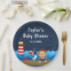 This cute and fun plate features a nautical sailor girl monkey on a wooden deck with a seagull and a crab. In the background there is a red and white lighthouse, a cute bird on a sailboat, ocean waves and a navy blue starry night sky. The text combines bold and serif fonts for a stylish and modern look. This is perfect for a nautical themed baby shower.