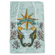 On the Front: This captivating design features two graceful seahorses encircling a nautical star, complemented by a gold scroll for a customizable message. Against a backdrop of tropical mint corals, this gift bag exudes a tranquil and summery vibe.