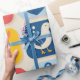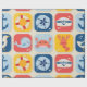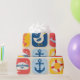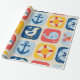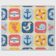 A playful grid pattern featuring charming nautical icons, including anchors, seagulls, whales, crabs, and lifebuoys. The colourful blocks of red, yellow, and blue create a lively and vibrant maritime theme.