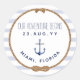 Nautical Boutique Co.'s "Our Adventure Begins" envelope seal features traditional classic styling combined with modern design elements. The typography includes a modern hand-written font and a classic block lettering reminiscent of nautical styling. The border is a rope tied in an "infinity knot," and the background is a classic nautical blue and white stripe with a modern watercolor finish. The design is accented with a watercolor anchor. #Nautical #Adventure #Infinity