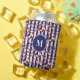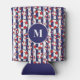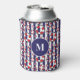 Nautical can cooler with sailing boat lifebelts over navy blue and white stripes. There's a monogram circle on the front and back to add your own initial