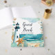 Beautiful birthday party guest book with a nautical black and white lighthouse, starfish and shells. Perfect for a birthday party. The words can be changed to suit your own details or requirements