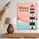Stretched canvas with a nautical design of a black and white striped lighthouse on a background of blue ombre' stripes and orange sunset. Custom text says "Welcome to our home." Contact me for assistance with your customization or to request additional matching or coordinating Zazzle products.