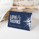 Designed to coordinate with our Nautical Modern wedding invitation suite, these summery navy blue and white thank you cards feature "Love & Thanks" in bold white lettering with your name or choice of personalization, and a white compass illustration. Add an optional inside message to make your thank you notes a breeze.