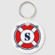 Nautical monogram ring buoy logo round button keychain. Cute Birthday gift idea for sailor, boat captain, skipper, dad, mom, boy, girl, sailing enthusiasts, kids, traveller, cruise ship trip etc. Add your own name initial letter. Custom maritime theme key chain for adults and children. Navy blue white and red rescue lifebuoy lifesaver logo icon. Also nice as wedding party favour for guests.