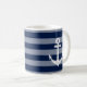Nautical mug with custom monogram and vintage ship / boat anchor. Cute maritime gift idea in navy blue and white colours with striped pattern. Great party favour present for beach theme wedding, engagement, bridal shower, birthday or anniversary. Monogrammed coffeemug with modern stripes. Nice gift idea sailors and sailing enthusiasts. Add your own name initials. Last name or family surname letter.