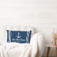 A nautical navy blue lumbar pillow featuring a classic anchor and triple-stripe border with customizable boat name and port location. Bold white graphics on a rich navy background deliver clean maritime style perfect for boat cabins, coastal porches, or lake house seating. All text is fully editable to showcase your vessel's name and home port. A great personalized gift for any boat owner or sailing enthusiast.