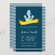 Modern Baby Shower Invitation featuring a navy striped background, yellow banner and anchor.