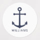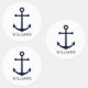 Modern Minimalist Nautical Round Labels feature navy blue anchor with personalized name in navy blue modern sans serif font style on white background.