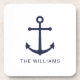 Modern Minimalist Nautical Coasters featuring navy blue anchor with personalized name in navy blue modern sans serif font style on white background.