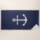 Modern Minimalist Nautical Beach Towel featuring white anchor on navy blue background.