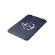 Personalized nautical bath mat with a white anchor design and custom family name in a white classic serif font on navy blue background.