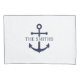 Personalized nautical design featuring a navy blue anchor with your custom family name in a classic serif font.