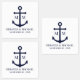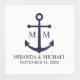 Designed with a navy blue anchor illustration, it features personalized bride and groom monogram, name, and wedding date in a navy blue serif font on a white background.