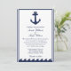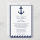 Nautical navy blue and white wedding invitations - the front design is comprised of a anchor, rope, and on the bottom ocean waves. The designs, text, and outlines is in navy blue with a white background. On the back is a larger anchor and a white border on top of a navy blue background. The paper by default is set to basic invitation stock, but can be changed by clicking 'choose your style' then using the Paper drop down box pick one of the options. Each invitation comes with a white envelope. To change the font, font size, or font colour, click the customize button below the Nautical wedding invitation. Note you may have to customize it if certain wording is too long and so it fits the design better. If your satisfied with the font setup, you can use the personalize feature to change the demonstration information to your personal details. Clicking the small images of the front/back of the card with change to that side so it can be altered. When done check the information you applied is correct and that you have no spelling errors on both sides of the card.
