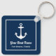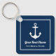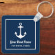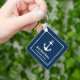 Nautical square keychain features a simple, stylish navy blue and white coastal style design with boat anchor accent. Personalize the custom text with the name of your boat along with her location city and state.