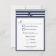 Nautical navy blue swallows RSVP invitations 2 menu choice - the front design features a anchor ribbon with a outline that runs along the edges of the card. The designs and text are navy blue on top of a white background. The back design continues the ribbon around the card and the outline and background colours have now been switched, where the outline is white and the background is navy blue. In the middle is two swallows in flight, working together to carry a anchor on a rope. The paper by default is set to basic invitation stock, but can be changed by clicking 'choose your style' then using the Paper drop down box pick one of the options. Each invitation comes with a white envelope. To change the font, font size, or font colour, click the customize button below the Nautical RSVP invitation. Note you may have to customize it if certain wording is too long and so it fits the design better. If your satisfied with the font setup, you can use the personalize feature to change the demonstration information to your personal details. Clicking the small images of the front/back of the card with change to that side so it can be altered. When done check the information you applied is correct and that you have no spelling errors on both sides of the card.