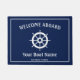 A nautical style "Welcome Aboard" boat mat. With a navy blue background, there is white border and in the middle, a white image of a boat's helm/wheel. Above, in modern white typography is "Welcome Aboard" and underneath you can easily customize with your boats name as well as location.