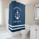 A striking nautical shower curtain featuring a bold anchor with your family name in elegant script, established year, and "Lake House" in classic serif type. The navy blue background with white graphics and a coordinating stripe at the bottom creates a polished coastal look. A stunning focal point for a lake house, boat house, or nautical-themed bathroom. All text is fully customizable.