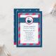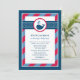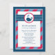 This cute nautical baby shower invitation features a friendly navy whale with heart-shaped water splashes, set against a bold navy blue and red polka dot and stripe design. The classic nautical colour combination is perfect for a baby boy celebration. A coordinating whale pattern dresses up the back of the card. All wording is fully customizable for your event.