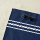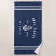 Up your boat game with these personalized beach towels in classic nautical navy blue and white. Personalize with your boat name, ship's registry, and year established in rustic white lettering with an anchor illustration and rope stripe detailing along the sides.