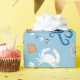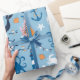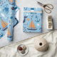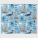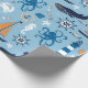 Ocean and nautical theme design features whales, orange sailboats, octopus, crabs, seahorses, ships wheels, anchors, lighthouses, and more on a pretty light blue background.