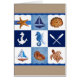 Original watercolor painted design by Sandra Gale, featuring blocks of nautical themed drawings like star fish, anchor, ship, turtle, and shells. Great design for the summer, beach homes, bungalows or for anyone who loves the beach, ocean or fish.