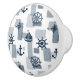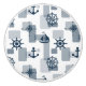 Seamless nautical themed design with sailing boat, compass, anchor and sailing wheel decoration on blue and white geometrical background