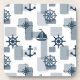 Seamless nautical themed design with sailing boat, compass, anchor and sailing wheel decoration on blue and white geometrical background