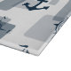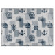 Seamless nautical themed design with sailing boat, compass, anchor and sailing wheel decoration on blue and white geometrical background