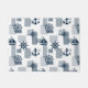 Seamless nautical themed design with sailing boat, compass, anchor and sailing wheel decoration on blue and white geometrical background