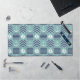A quilt inspired pattern of stormy turquoise squares, decorated with a white sailboat and anchor, and deep navy blue squares, accented with paler blue chevrons and waves, is accented by white stitching to create a classic nautical feel.