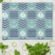 A quilt inspired pattern of stormy turquoise squares, decorated with a white sailboat and anchor, and deep navy blue squares, accented with paler blue chevrons and waves, is accented by white stitching to create a classic nautical feel.
