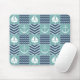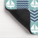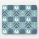 A quilt inspired pattern of stormy turquoise squares, decorated with a white sailboat and anchor, and deep navy blue squares, accented with paler blue chevrons and waves, is accented by white stitching to create a classic nautical feel.