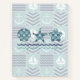 A quilt inspired pattern of stormy turquoise squares, decorated with a white sailboat and anchor, and deep navy blue squares, accented with paler blue chevrons and waves, is accented by white stitching to create a classic nautical feel. On the front, two different starfish styles and a classic seashell mask the pattern with waves below to add a fun final touch.