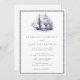 This elegant wedding invitation features a vintage illustration of a sailing ship, which you can replace with an image of the boat where you will be married (transparent or white background preferred). Elegant dark blue lettering in serif and script fonts lay out the bride and groom names, and details of the wedding, including the location, date, time, and reception. Finally, a rope border ties the design together.