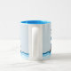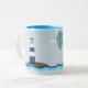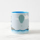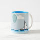 Two tone mug with a nautical scene of a sailboat sailing in a wavy ocean with a hot air balloon above floating passed a lighthouse.