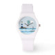 Ladies watch with nautical scene of a sailboat sailing in a wavy ocean passed a lighthouse with a hot air balloon floating in the sky above.