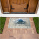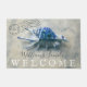 Welcome your family and friends with one of our personalized doormats. This nautical inspired design has a photographed blue seashell in the centre on a background of sand. Above is a postage stamp area to put your town, date and state. Below the shell is your family name in a modern script typography for you to personalize ad the word "Welcome". Designed by world renowned artist ©Tim Coffey.