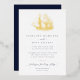Another nautical formal wedding invitation by JessicaAmber. This classic card features a detailed illustration of a frigate sailing ship, which you can replace with an image of the boat you will be married on (transparent or white background preferred). The ship will be rendered in gold foil. Elegant dark blue lettering displays the bride and groom names, and details of the wedding, including the location, date and time.