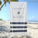 Nautical beach towel features a coastal style starfish and stripes design. Personalize the custom text with a family last name and beach house (or other title) with the year established and location. Hale navy blue and sea salt colour scheme.