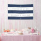 Welcome guests to your nautical themed, summer or coastal rehearsal dinner with this eyecatching navy blue and white striped banner. Personalize with three lines of custom text accented with two white anchor illustrations. Shown with "tomorrow we do! Congratulations [name] and [name]."