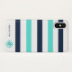 Nautical phone case with stripes in various colours of teal, navy blue, coral and gold with compass at the bottom and your own monogram