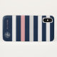 Nautical phone case with stripes in various colours of teal, navy blue, coral and gold with compass at the bottom and your own monogram