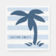 Pretty paper napkins with a stenciled palm tree and blue and white stripes. The wording reads "Welcome Guests". Lovely for your summer gatherings. Goes great with coastal kitchen decor.