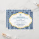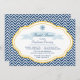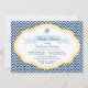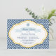 This 5x7 Bridal Shower invite has a nautical theme. In the background, there is a navy blue and white chevron zigzag pattern with a gold and white curvy frame in the middle. At the top, there is a navy blue boat steering wheel with a heart in the middle. Below, Bridal Shower is written in a cursive font on a soft blue banner. Below, you can customize all of the bridal shower information. Copyright GraphicMarket