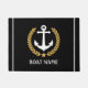 Decorate your home entryway with a nautical themed doormat and your personalized boat name, family name or other desired text. Featuring a custom designed boat anchor with a gold style laurel leaves and star emblem with nautical rope stripes on a stylish black background or easily adjust the primary colour to match your current decor or theme.